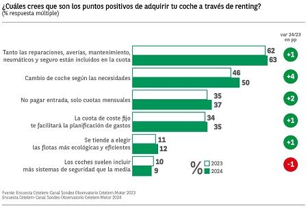 Las características más ventajosas del renting según los conductores encuestados son que las reparaciones y mantenimiento del coche estén incluidos en la cuota mensual (63% frente al 62% en 2023) y también poder cambiar de coche según las necesidades (50% frente al 46% en 2023). También destacan el hecho de no pagar entrada, sino solo mensualidades (un 37%), que la cuota mensual fija facilita la planificación de gastos (un 35%), que se tiende a elegir vehículos más ecológicos y eficientes (un 12%) y que los coches de renting suelen incluir más sistemas de seguridad que la media (un 9%).