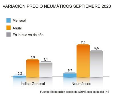 En términos mensuales, el estudio de ADINE muestra que en el mes de septiembre el precio de los neumáticos se incrementó un 0,7%, lo que supone, por un lado, seis décimas más que el registrado en el mes anterior y, por otro lado, también cinco décimas más que el IPC mensual de septiembre.