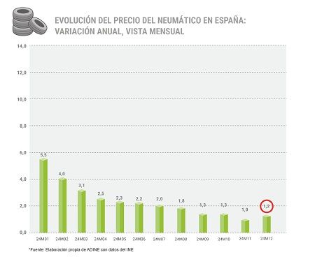 Según un estudio elaborado por la Asociación Nacional de Distribuidores e Importadores de Neumáticos (ADINE) basado en los datos definitivos publicados por el Instituto Nacional de Estadística (INE), el precio de los neumáticos experimentó un aumento del 1,2% en 2024.