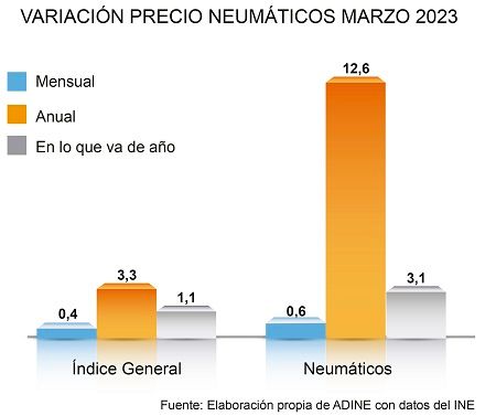 El precio de los neumáticos continúa su encarecimiento en marzo hasta alcanzar el 12,6%, a pesar incluso de la moderación del IPC, según un estudio elaborado por la Asociación Nacional de Distribuidores e Importadores de Neumáticos (ADINE) en base a los datos del Instituto Nacional de Estadística (INE).