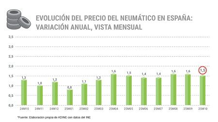 El precio de los neumáticos en España creció un 1,5% interanual en octubre de 2025, según los últimos datos publicados por el Instituto Nacional de Estadística (INE) y analizados por la Asociación Nacional de Distribuidores e Importadores de Neumáticos (ADINE).