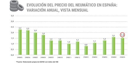 El precio de los neumáticos en mayo de 2025 experimentó una subida interanual del 1,5%, según los últimos datos publicados por el Instituto Nacional de Estadística (INE) y analizados por la Asociación Nacional de Distribuidores e Importadores de Neumáticos (ADINE).
