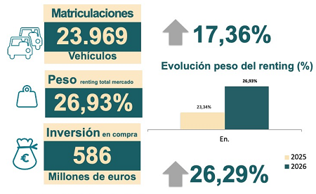La inversión total, realizada en la adquisición de vehículos nuevos por las compañías de renting, en enero de 2026, ha alcanzado los 586 millones de euros, un 26,29% más que en enero de 2025, cuando se contabilizó una inversión de 464 millones de euros.