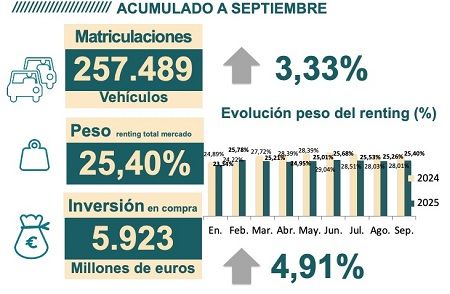 La Asociación Española de Renting de Vehículos (AER) ha publicado los datos de las matriculaciones de vehículos registradas por las compañías de renting, al cierre de septiembre de 2025, que se cifran en 257.489 unidades, un 3,33% más que en el mismo periodo de 2024, cuando se contabilizaron 249.183 vehículos.