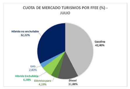 En cuanto al mercado de turismos electrificados, en julio aumentan sus ventas un 50,3%, con 8.584 unidades vendidas. Los eléctricos de batería (BEV) crecen un 63,6% hasta las 3.404 unidades en el mes, al igual que los híbridos enchufables (PHEV) que aumentan sus ventas un 42,7% con un total de 5.180 unidades. Las ventas de turismos electrificados representan el 10,57% de la cuota de mercado en julio. Mientras que, en el acumulado de año, se suman 64.126 turismos electrificados, un 46,3% más, que representa el 10,93% del mercado total.