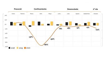 En lo que llevamos de año la evolución de las reparaciones ha vivido tres momentos y podría estar entrando en un cuarto si se confirma la tendencia. Arrancó 2020 con un crecimiento entre enero y febrero del 3% aproximadamente, para posteriormente caer a doble dígito por el confinamiento en los tres meses siguientes, en promedio un 58%. Solo a partir de junio, con la desescalada, el mercado logró ralentizar su descenso y retroceder entre el 3 y el 6%. Sin embargo, coincidiendo con el punto álgido de la segunda ola en octubre, la posventa volvió a ceder terreno, un 11%.