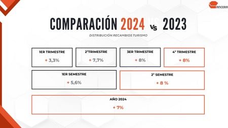 El estudio de actividad del cuarto trimestre de 2024 elaborado por ANCERA (Asociación Nacional de Comerciantes de Equipos, Recambios, Neumáticos y Accesorios de Automoción) revela un crecimiento del 7% en el sector de distribución de recambios de turismo respecto al año anterior. Este desempeño positivo se ha registrado en un entorno marcado por la estabilización de la inflación.