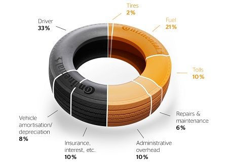 Las cifras sorprenden incluso a los expertos de la industria: los neumáticos representan solo alrededor del 2% de los costes operativos directos de una flota de vehículos comerciales. Sin embargo, a través de su influencia en el consumo de combustible, las emisiones de CO₂ y el cálculo de los peajes, pueden afectar hasta el 31% de los costes operativos totales.