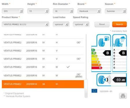 El Label Finder también permite a los usuarios comparar diferentes modelos y medidas de neumáticos respecto a la adherencia sobre superficies mojadas y a la eficiencia de carburante. "Siempre hemos diseñado nuestros productos centrándonos especialmente en la seguridad y en el medio ambiente, incluso mucho antes de que aparecieran las nuevas directrices de la UE", explicó Jin-Wook Choi, presidente y director ejecutivo de Hankook Tire en Europa.