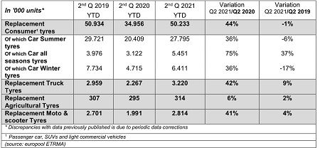 El mercado de neumáticos de consumo está impulsando el crecimiento con unas ventas de 50,23 millones de unidades lo que supone un aumento del 44% en relación con el 2020 y solo un 1% por debajo respecto al segundo trimestre de 2019. En este segmento cabe destacar los neumáticos all season con unas ventas de 5,45 millones de unidades con un crecimiento muy considerable del 75% respecto al segundo trimestre de 2020 y un crecimiento del 37% respecto a 2019.