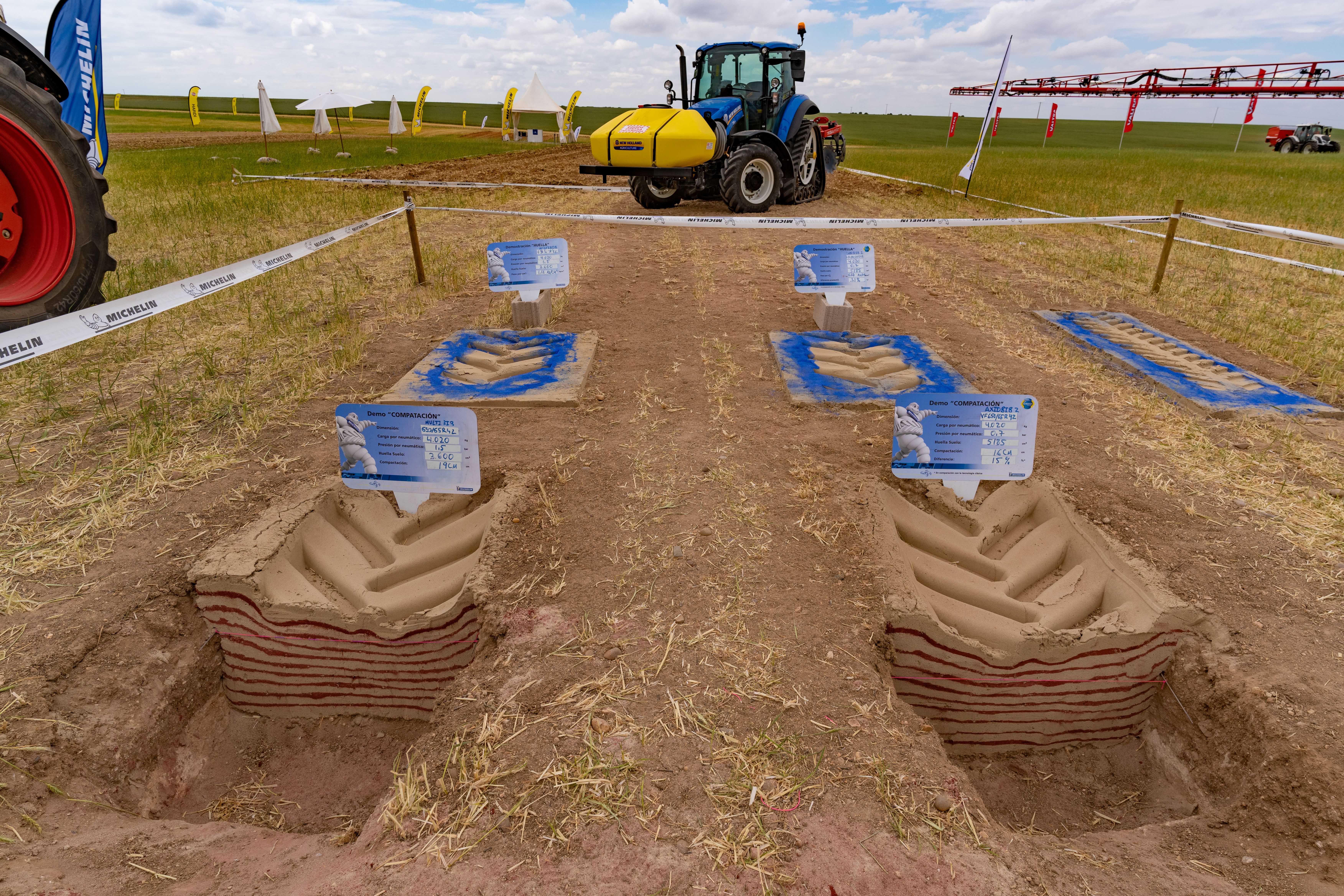 El análisis de las lasañas obtenidas en esta prueba pone de manifiesto que disponer de neumáticos con la tecnología Michelin Ultraflex (MUT) permite trabajar con presiones menores para un mismo peso del vehículo, lo que aumenta la huella en contacto con el suelo, optimizando el reparto de cargas al terreno, reduciendo la compactación del mismo hasta un 15%.