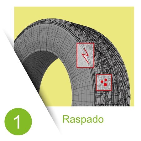 1. Raspado: En esta fase se elimina el caucho antiguo de la superficie de la carcasa, y de esta manera dejar una textura y superficie adecuadas para el correcto agarre de la nueva banda de rodadura.