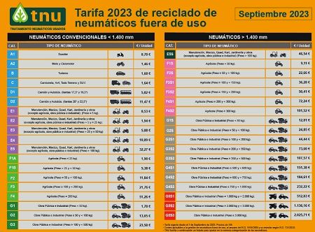 Con este fin, TNU modula sus tarifas atendiendo a distintas categorías de neumático, y a los costes necesarios para que la prestación del servicio de gestión de neumaticos fuera de uso mantenga en cada momento una adecuada relación coste-eficiencia en términos económicos, sociales y medioambientales. A estos efectos el Consejo de Administración de TNU ha considerado oportuno y necesario modificar la categorización F1, Agrícola de Peso < 50 kg, debido a que el intervalo de pesos que se abarcaba en la anterior categorización era demasiado amplio y producía cierta desproporcionalidad en la aplicación de la tarifa, por lo que se ha tomado la decisión de subdividir esta categoría en dos: