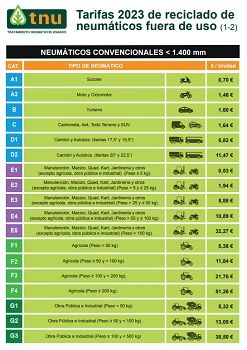 TNU modula sus tarifas atendiendo a distintas categorías de neumático, y a los costes necesarios para que la prestación del servicio de gestión de neumaticos fuera de uso mantenga en cada momento una adecuada relación coste-eficiencia en términos económicos, sociales y medioambientales.